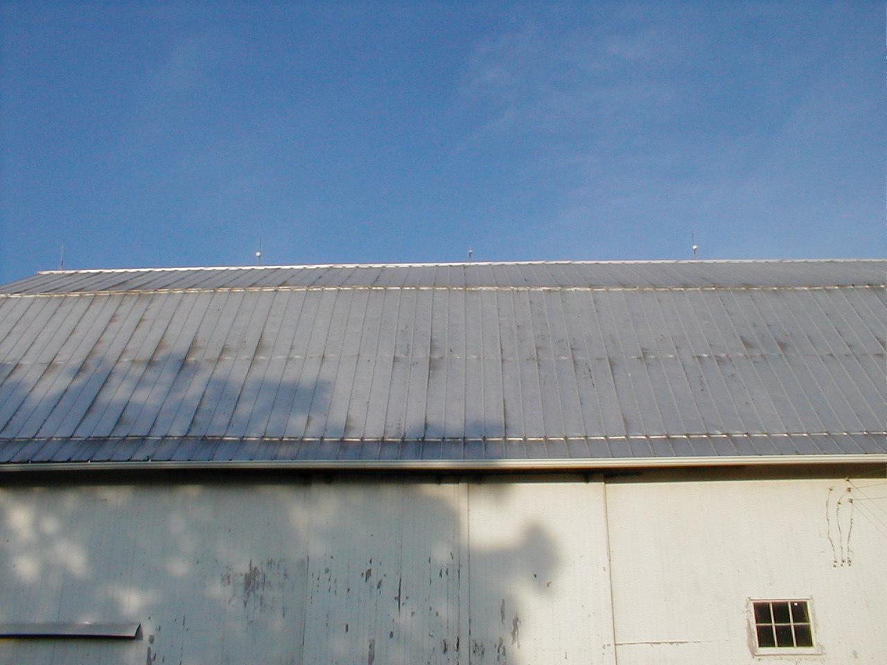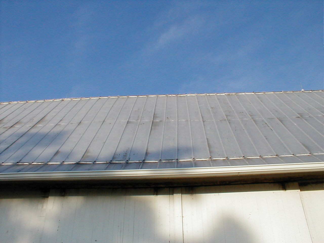 | When you look at things from a "kid's perspective", things aren't always "as they seem". (Hummm, that's also true now when I forget to take my medication)! One of our many simple pastimes as young kids was to throw stones on top of the barn roof and watch them "bounce back" and return down the roof to us! We just couldn't figure out as to how they returned to us rather than going over the other side of the roof. We even thought that they must have hit all the cattle manure behind the barn and then bounced back over the roof! Why one of us just didn't go behind the barn and see what actually caused the stones to bounce back, I'll never know. I guess as young kids we were too busy having fun at it, that we didn't really care how it happened, but just that it happened. It wasn't until we were older (hey, not that much older), that we finally realized what the real cause was. Since we were young, we had to stand close to the barn in able to get the stones to go "over the top" of the roof. The pic below shows our perspective then: |