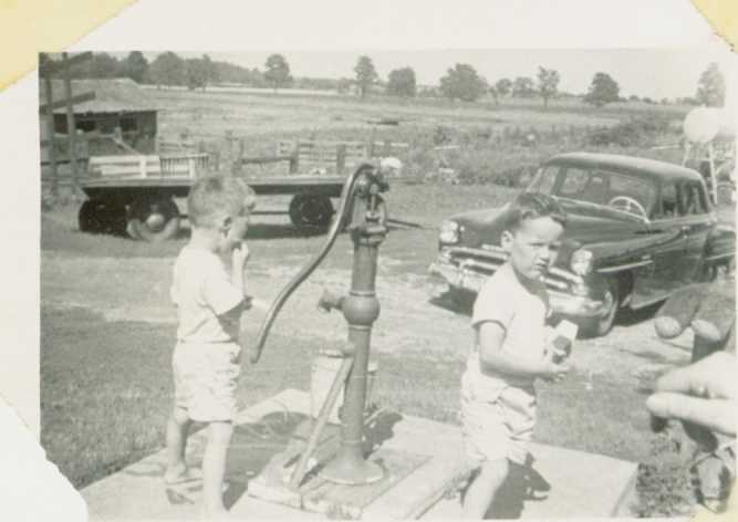 | WELL, WELL! LOOK WHAT I FOUND RUMMAGING THROUGH OLD PHOTOS! A PIC OF AROUND THE TIME THE STORY "AN INSIDE JOB" TOOK PLACE! THIS IS TIM AND I AT THE PUMP AND OUR AUNT LOU'S CAR WE "WASHED" (WOW! DID WE EVER!!!) |
